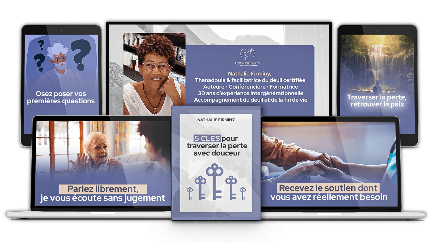 Je suis Nathalie Firminy, Thanadoula certifiée, facilitatrice du deuil et formatrice. J’accompagne les 50+ dans toutes leurs pertes, décès, ruptures, transitions avec bienveillance et humanité.